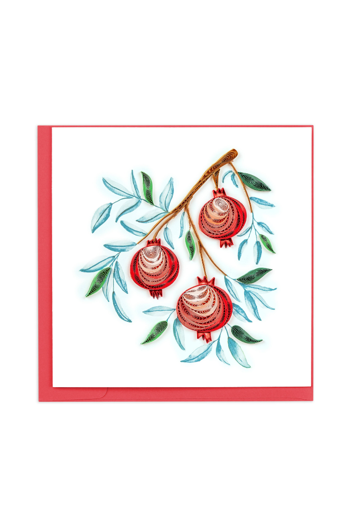 Embrace the richness of nature with this quilled greeting card featuring a pomegranate branch. Handcrafted with intricate detail, the vibrant red pomegranates and lush green leaves create a stunning design.