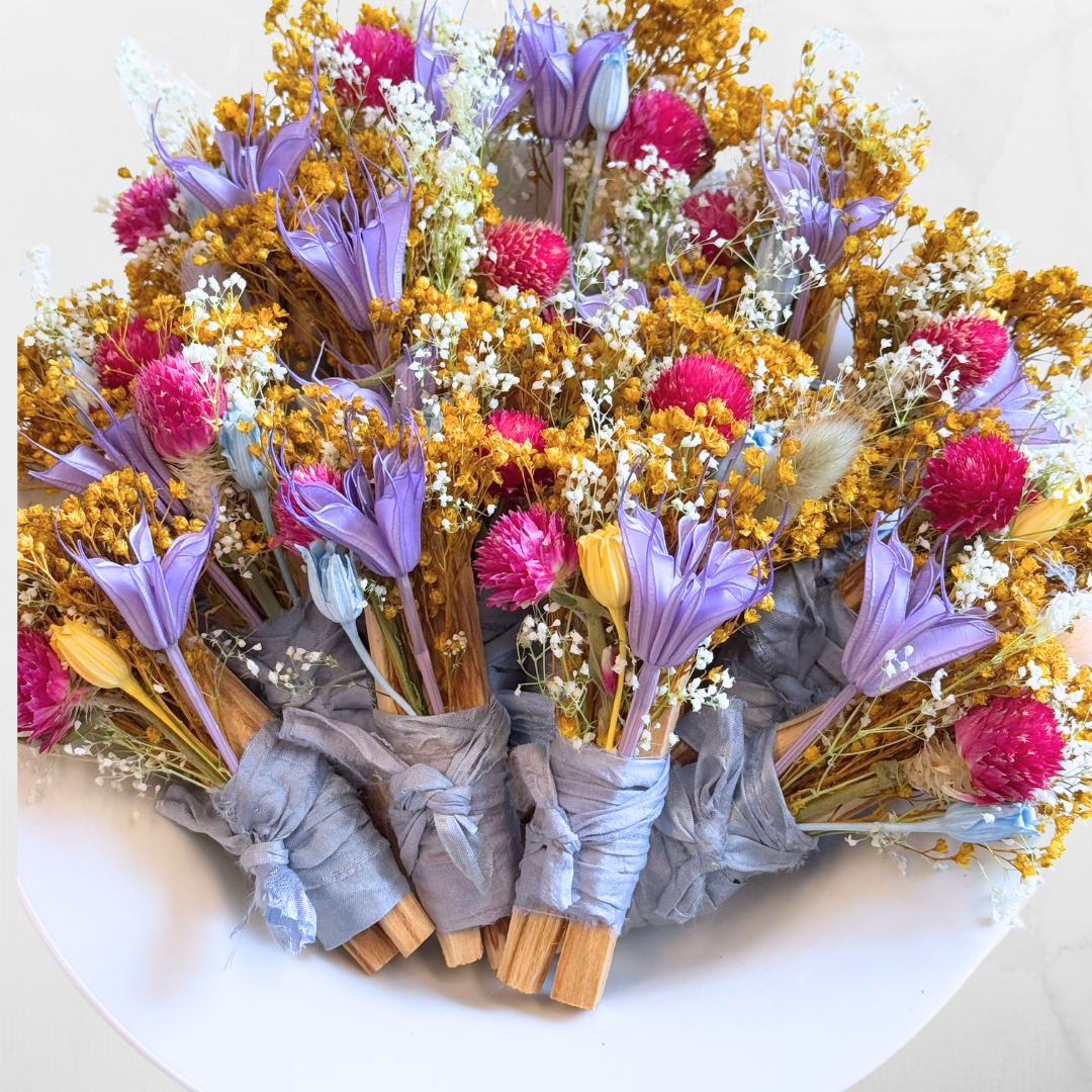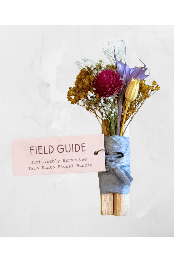 A bundle of two sticks of ethically sourced and sustainably harvested Palo Santo and naturally preserved wildflowers hand bundled with recycled sari silk ribbon and love. Measures approximately 4 inches. Ethically sourced from Ecuador.
