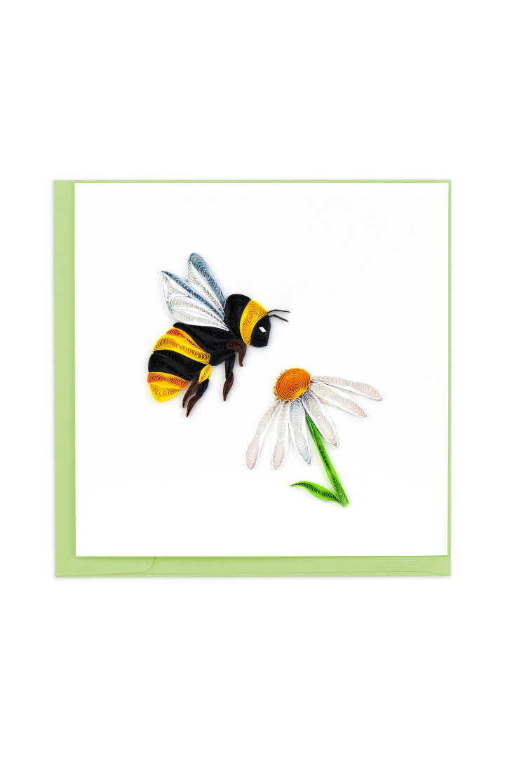 Share the new buzz with a friend in a handcrafted Bumble Bee card! A bumble bee symbolizes community, brightness and personal power. The card design depicts a flying Bumble Bee with black and yellow stripes about to land on a white spring daisy. The perfect card to send in the spring to your queen bee!