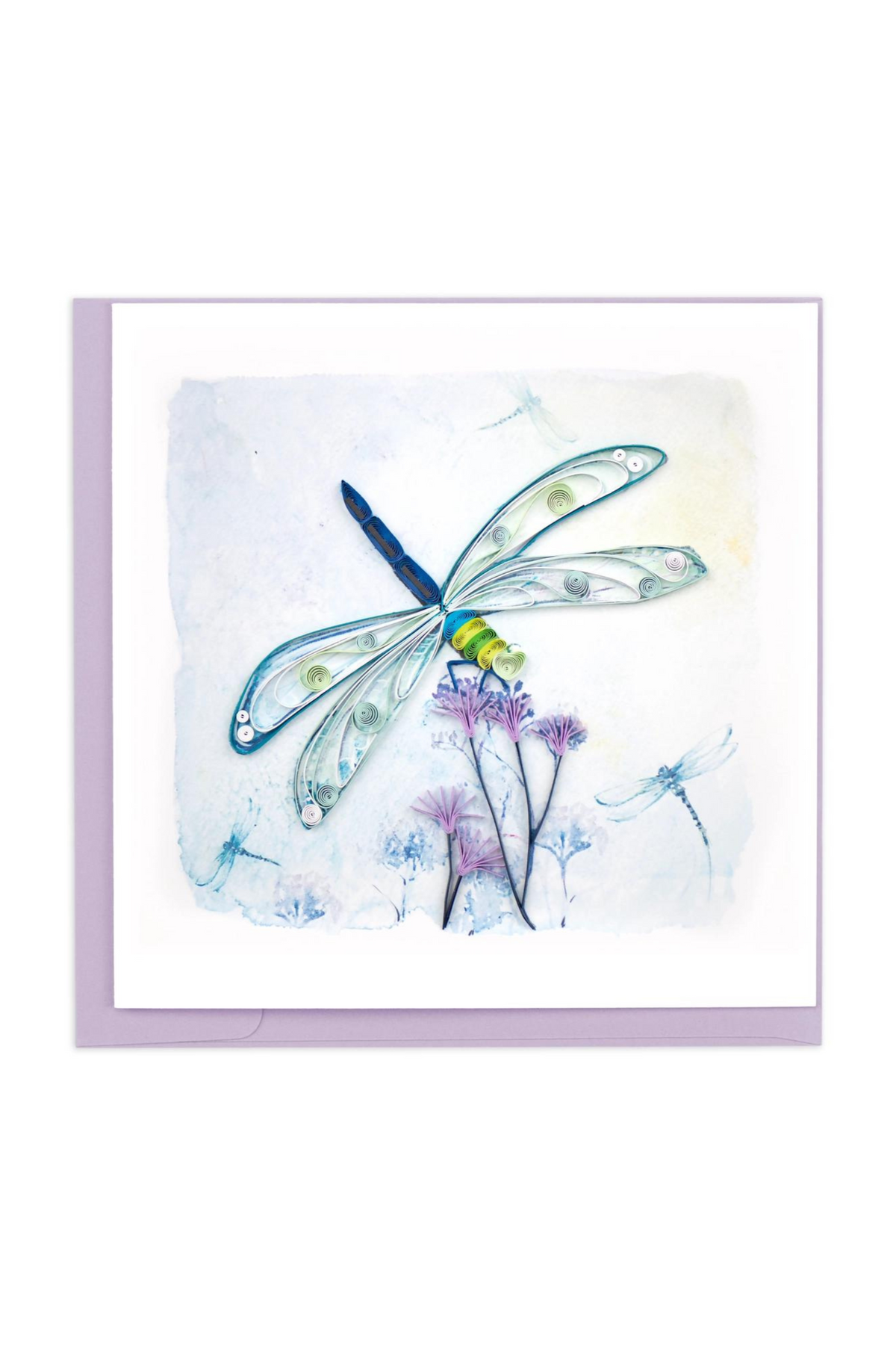 Send a quilled emperor dragonfly to a friend with a note of encouragement for a new stage in life. Emperor dragonflies are a symbol of learned self that comes with maturity. This card depicts the blue and green emperor dragonfly perched on purple flowers with a faded watercolor background with other dragonflies flying past.