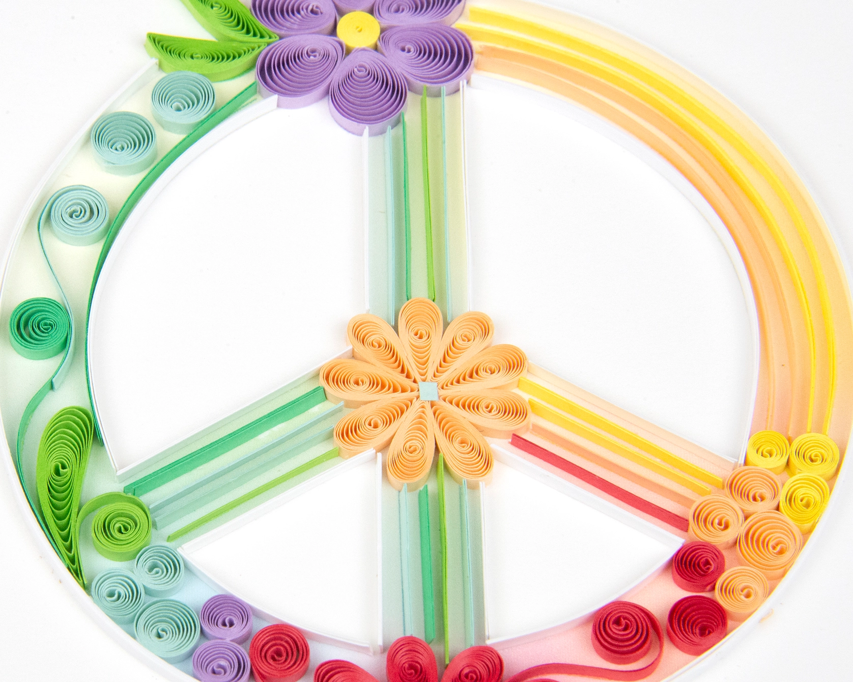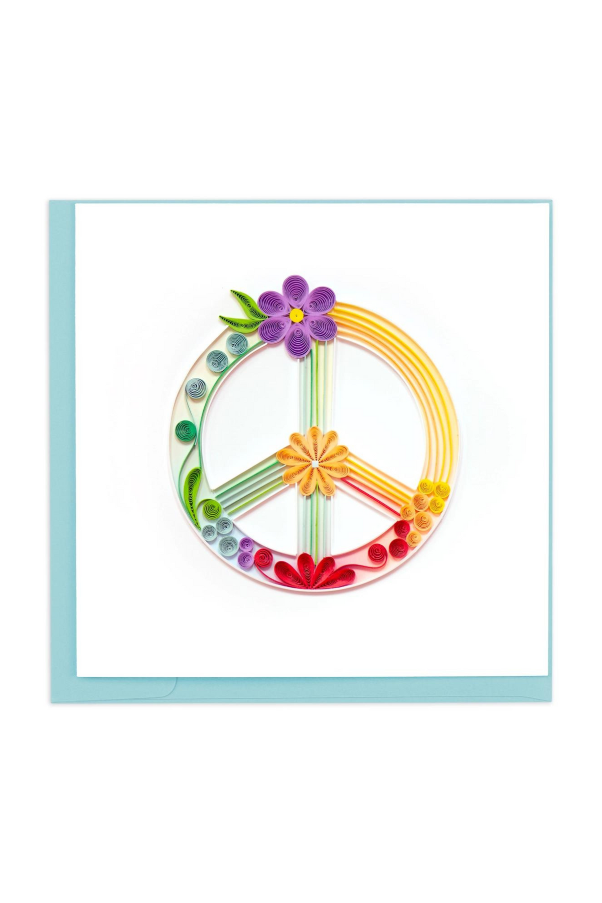 Send peace and love to your friends and loved ones with the Quilled Peace Sign card. The artwork features a peace sign symbol quilled in green, yellow, and red lines and swirls with orange and purple flowers.