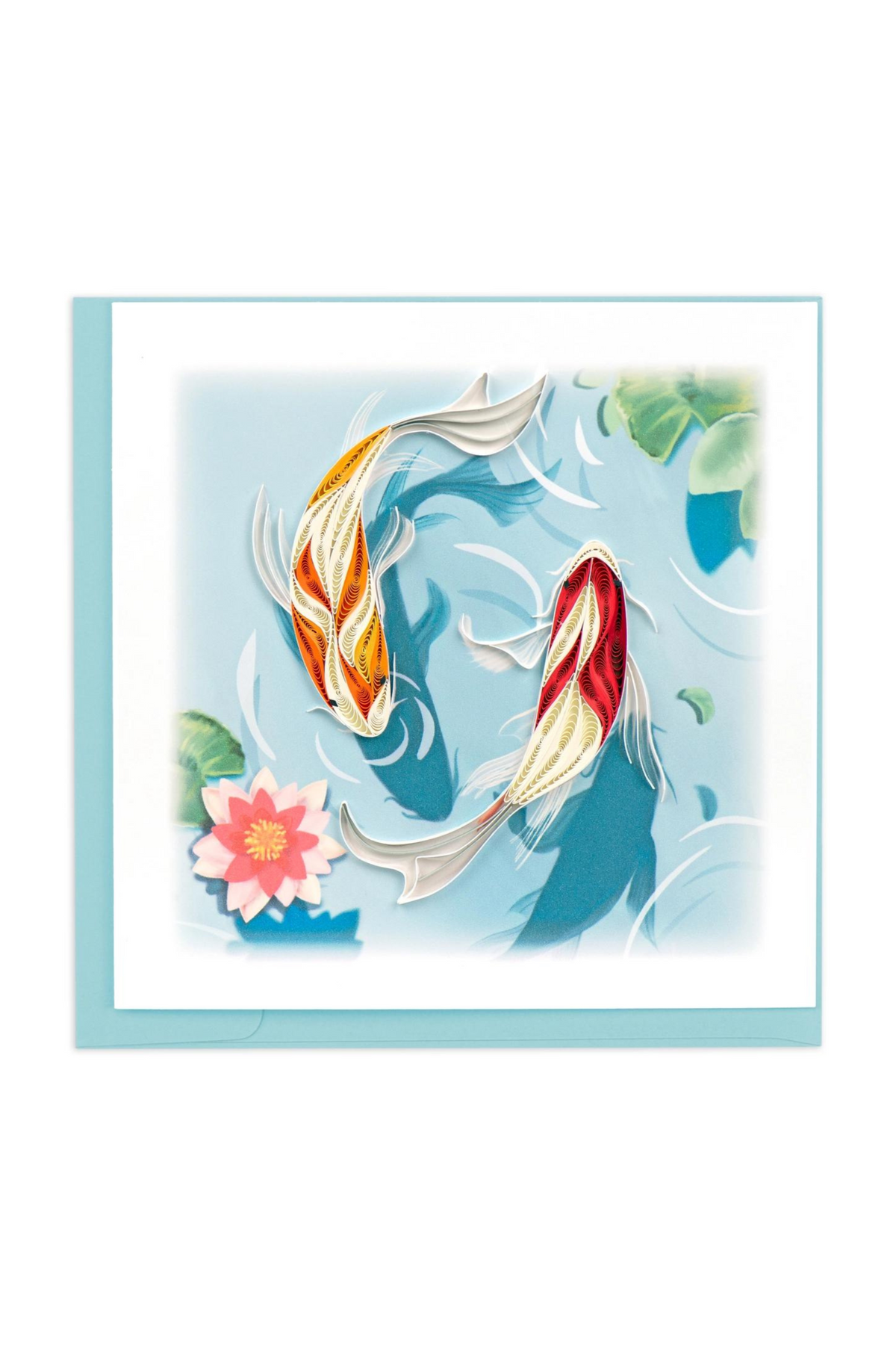 Send this Koi Fish Greeting Card to convey good fortune! The quilled design features two koi fish, each having a different pattern in coordinating colors of red, orange, white, and gray. The background printing shows faint blue hues indicative of water, in addition to several light green lily pads.