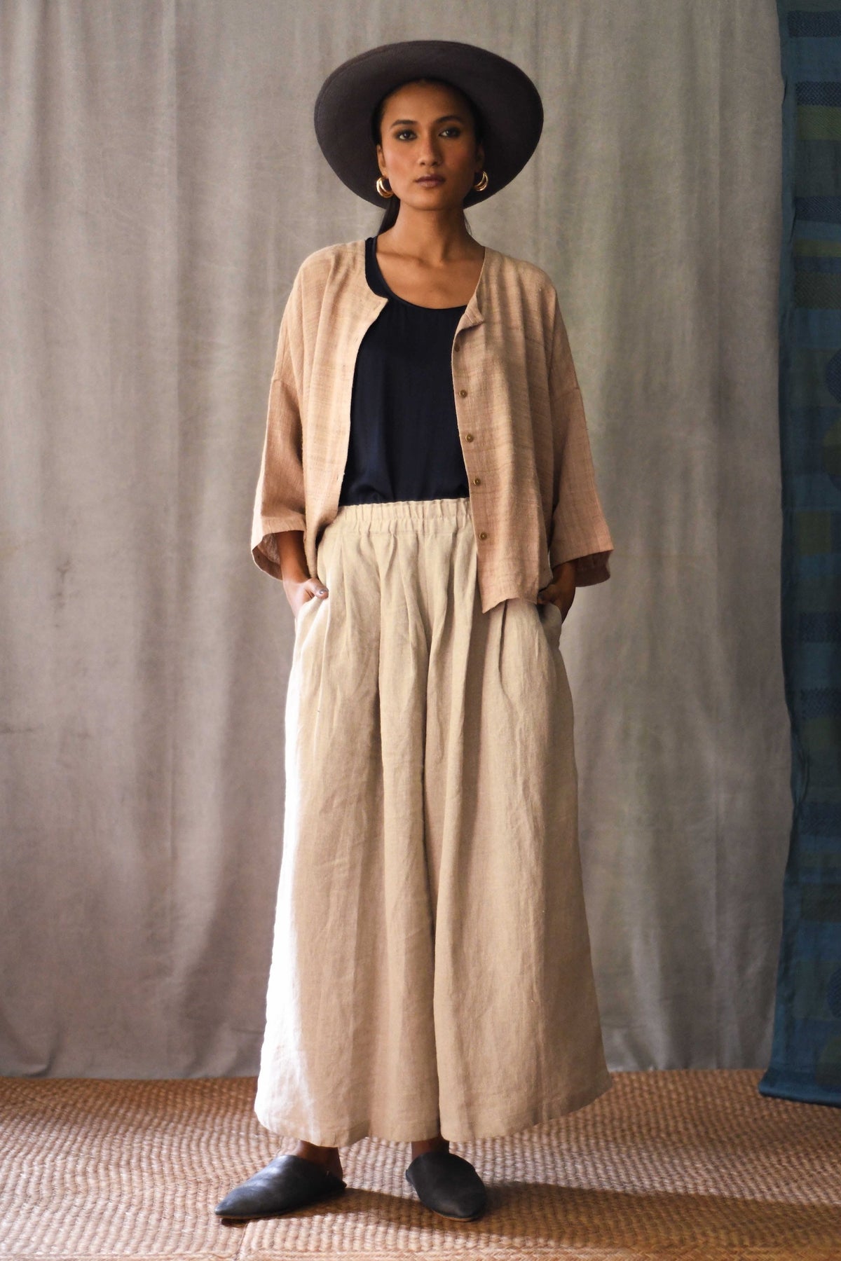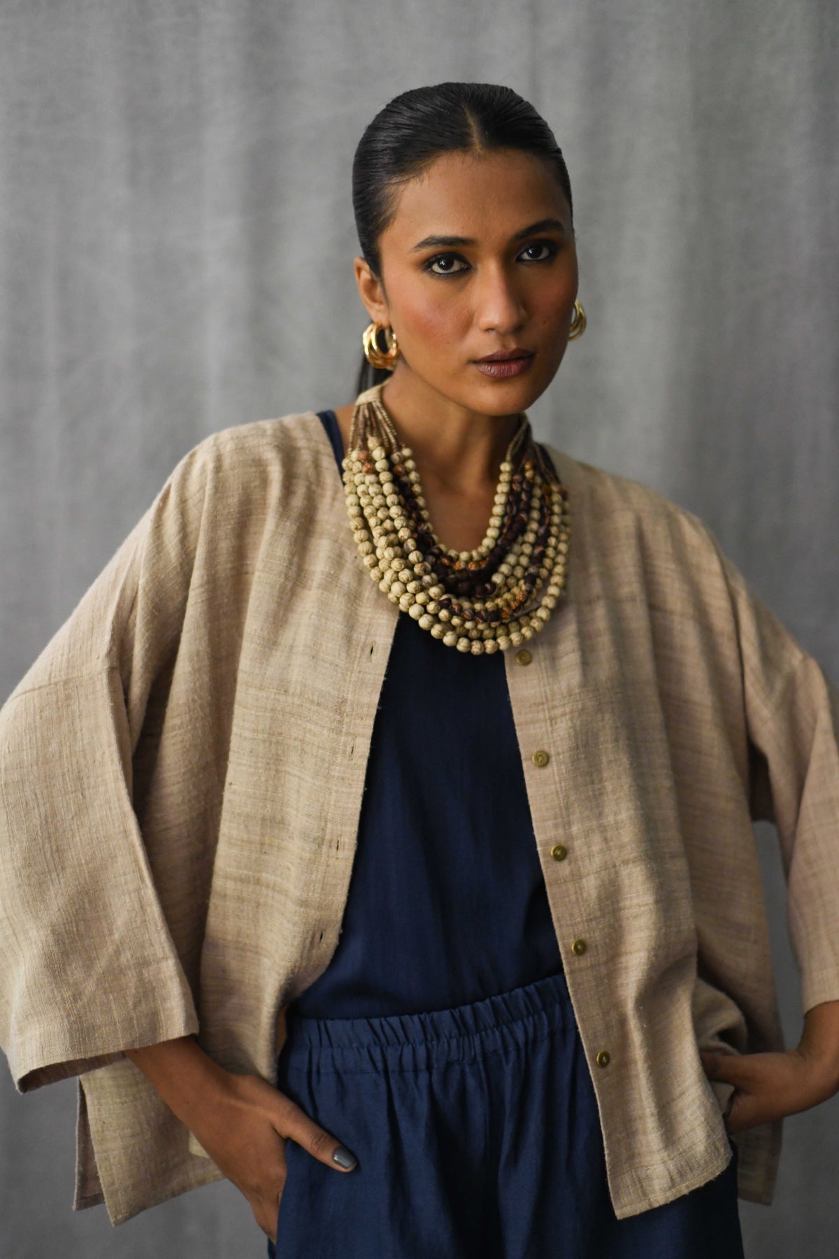 Each piece is made from peace silk, meaning the silk is produced without harming the silkworms. The fabric is hand-spun and woven by a weaving collective in Assam, India, and dyed using natural dyes.