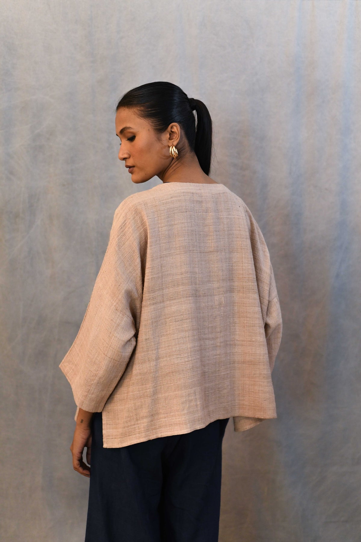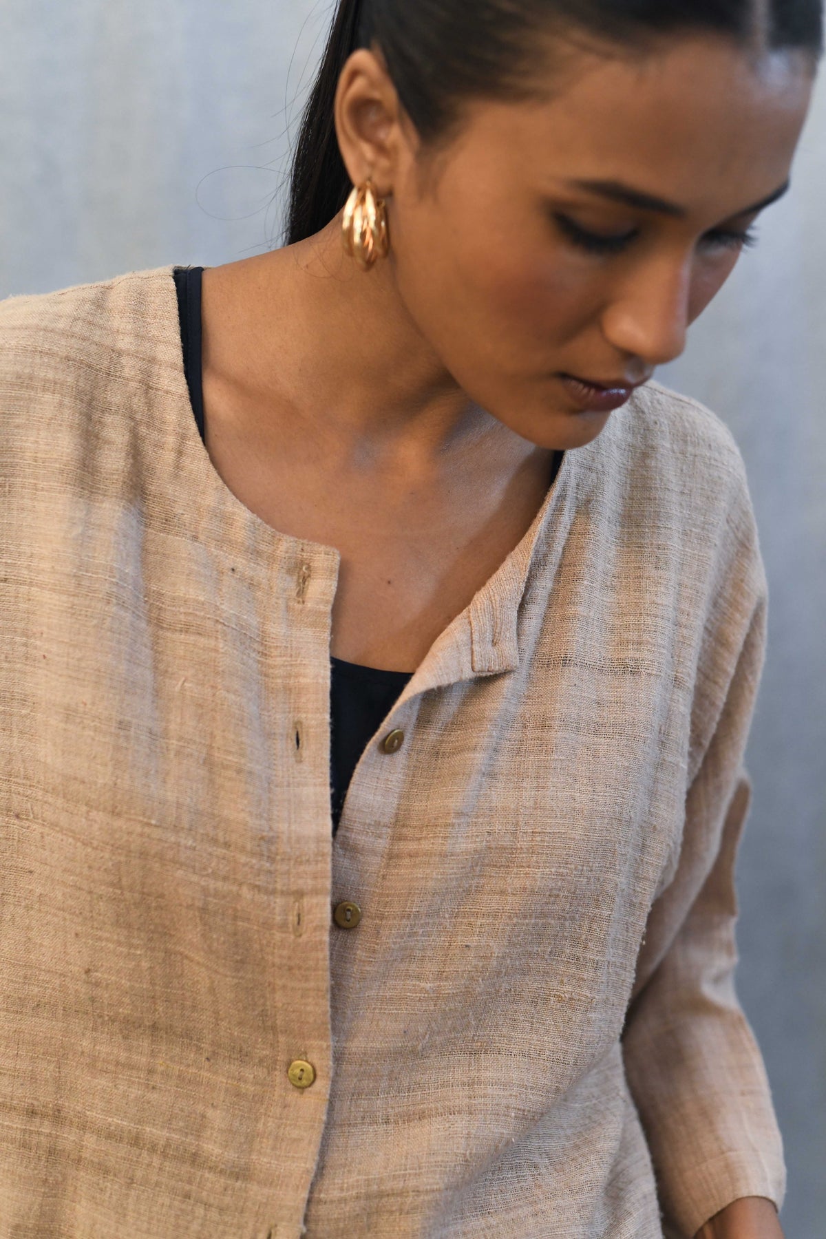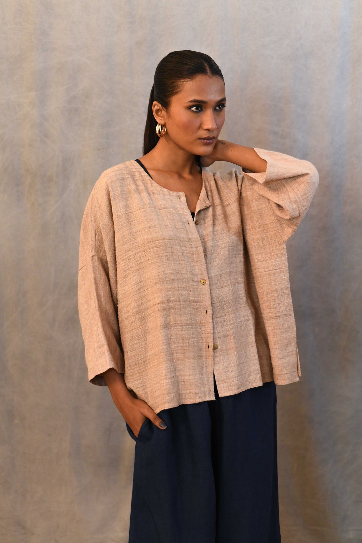 An easy, relaxed boxy top with a soft scooped neckline and button-down front. Designed with a wide, airy silhouette and 3/4 length sleeves, it can be worn as a top or layered open over a slip dress or tank. The slightly slubbed silk has a beautiful texture and gentle drape, making it an effortless everyday piece that still feels special.