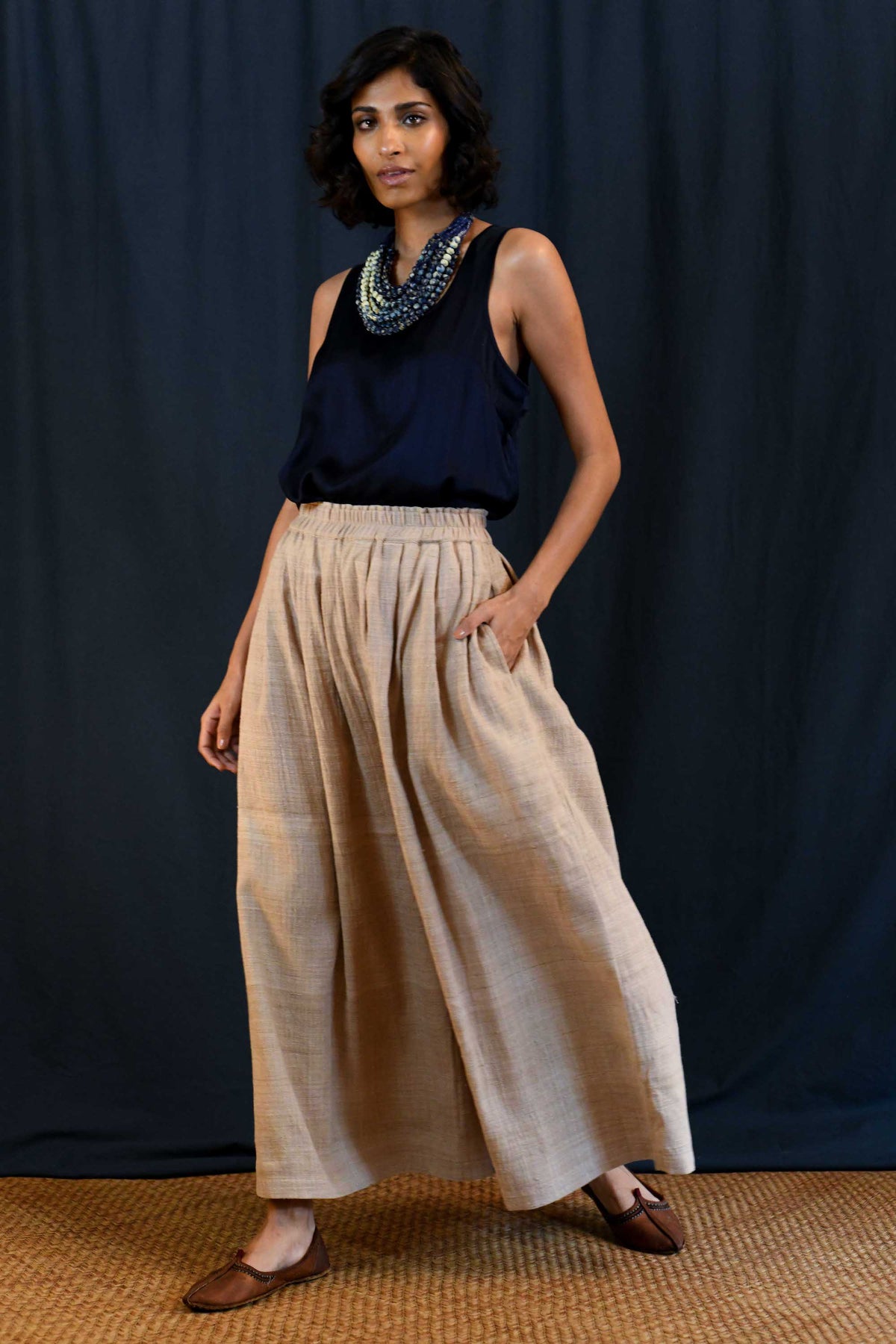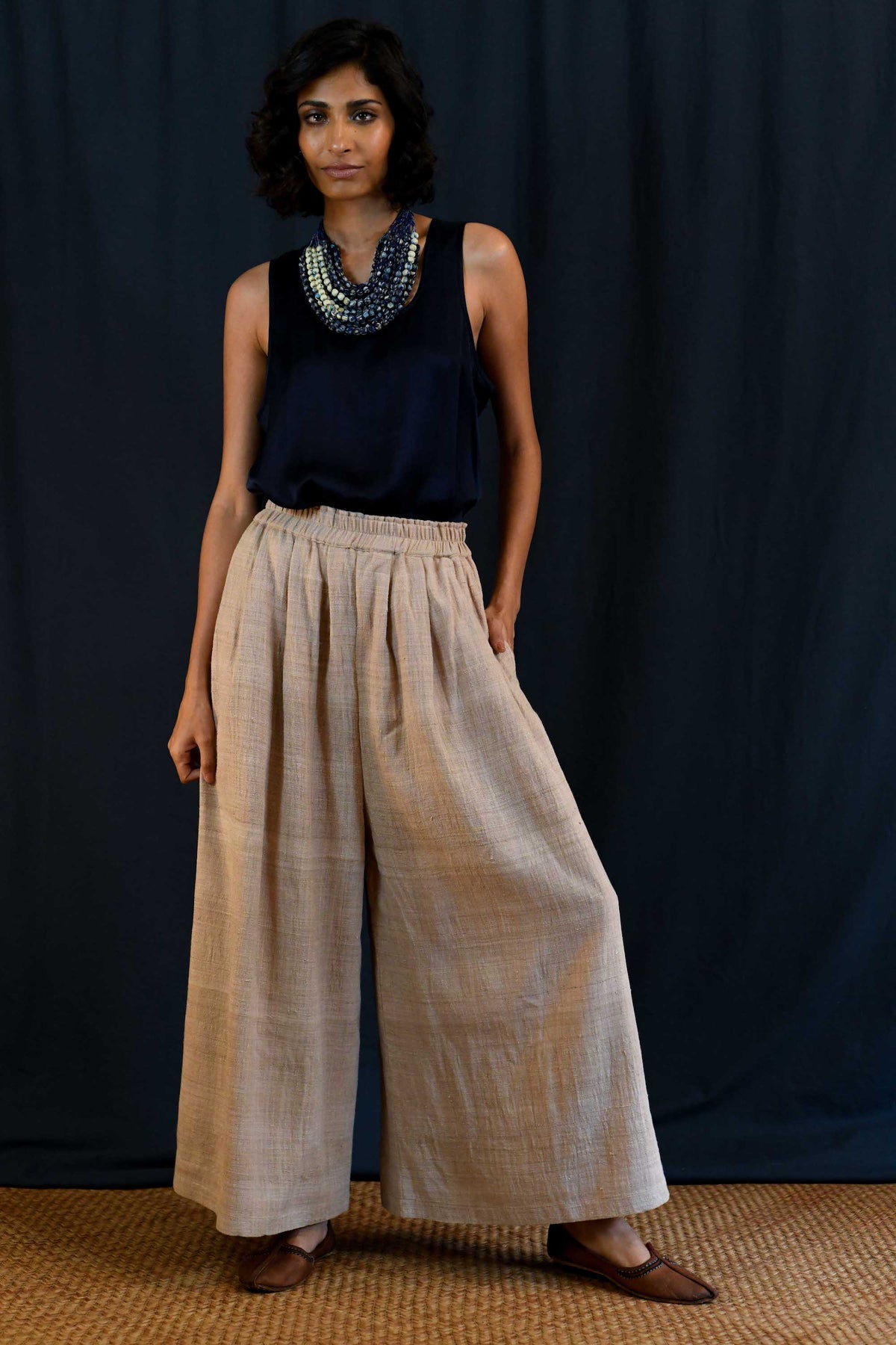 Effortless wide-leg palazzo pants designed for comfort and ease. With a soft elastic waistband and relaxed, low-crotch silhouette, these are the kind of pants you’ll reach for again and again. They pair easily with many pieces in the collection and strike the perfect balance between timeless style and everyday comfort.