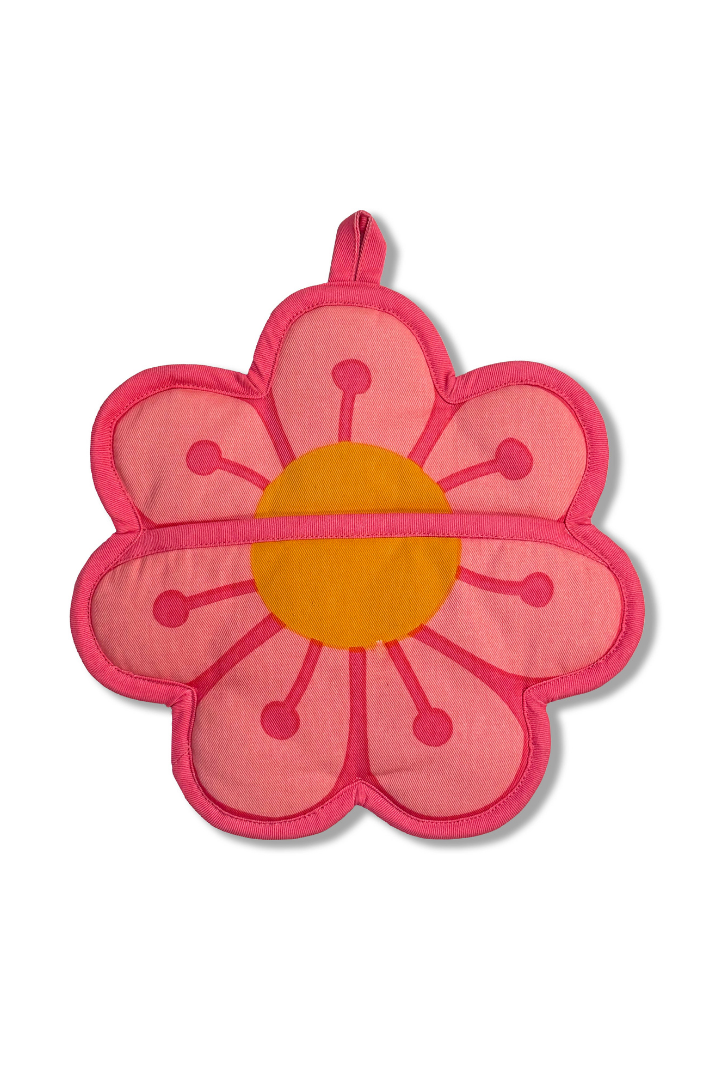 Blossom Pot Holder is a playful yet durable kitchen essential for safely handling hot cookware. Made with a 100% cotton outer layer, this flower-shaped pot holder features front-and-back artwork, a built-in pocket for heat protection and secure grip on hot dishes, and a hanging loop that makes it easy to store or display.