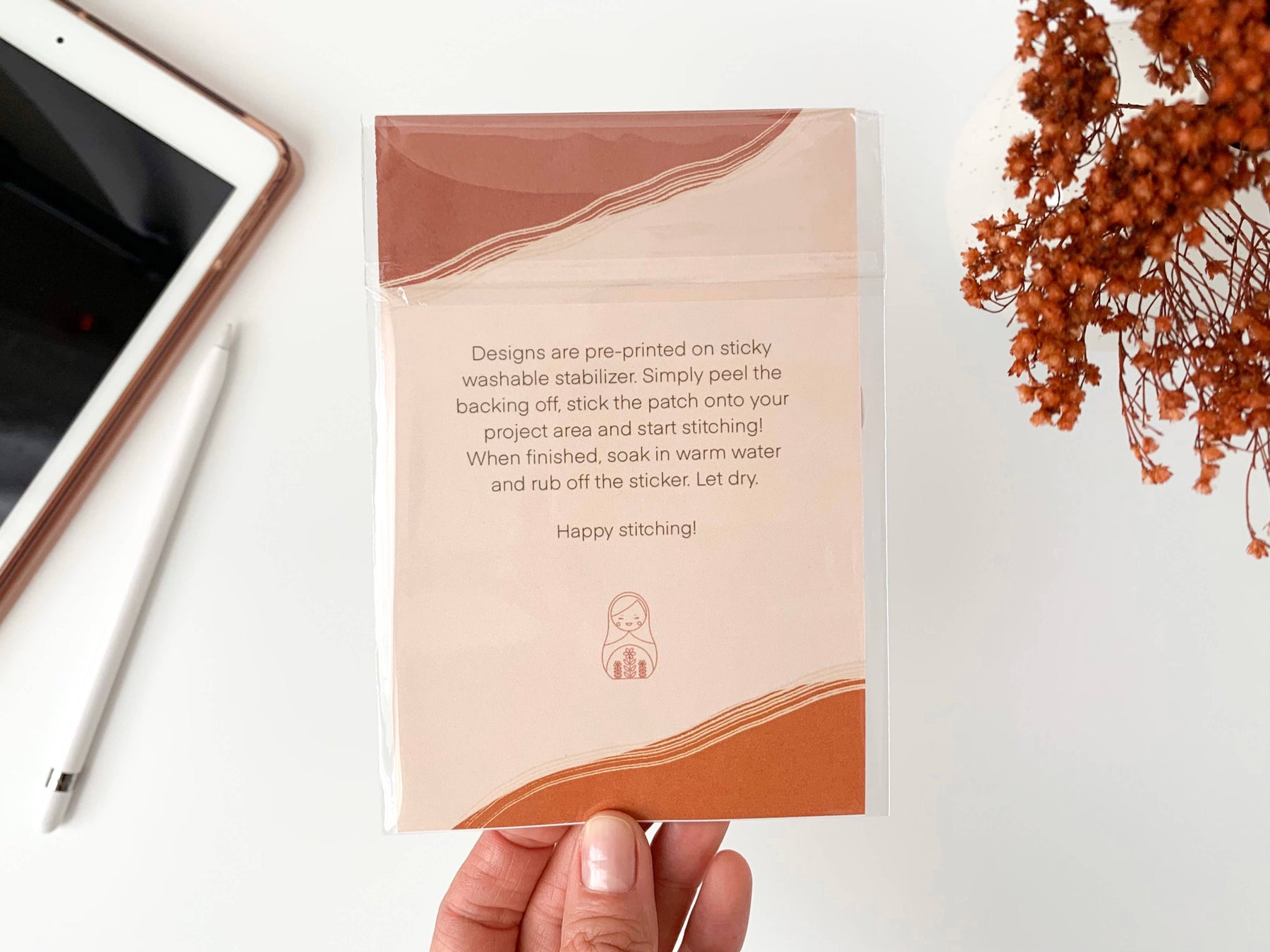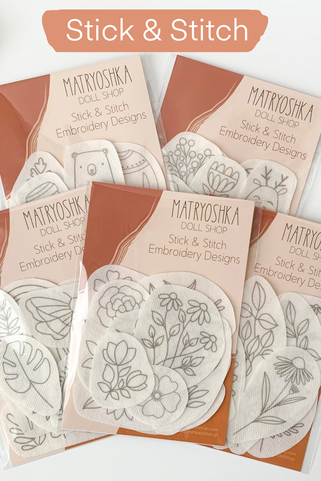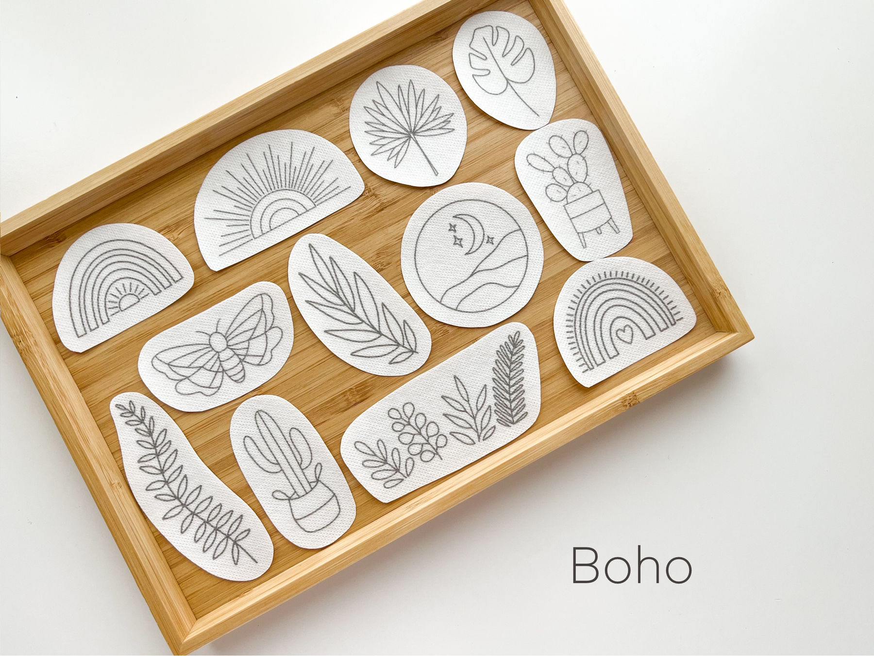 • Available in: Floral, Botanical, and Boho. Designs are pre-printed on sticky washable stabilizer